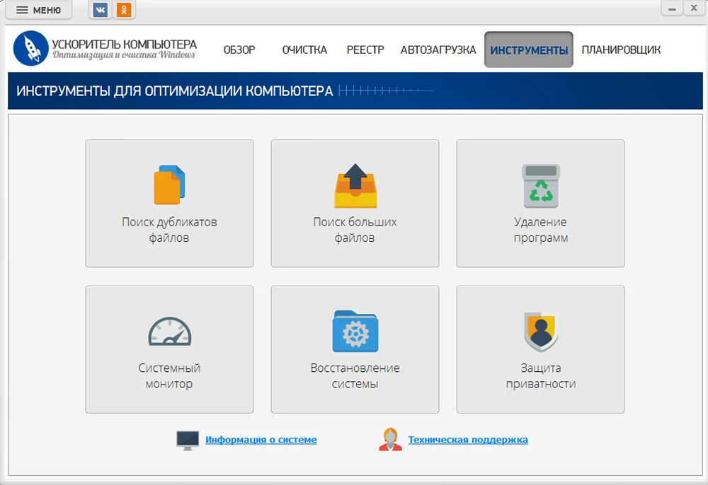 - есть инструменты для очистки ПК от мусора;