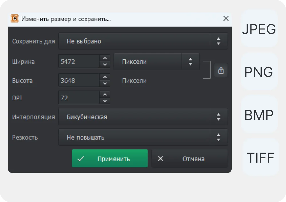 Сохраните фотографию в формате JPEG, TIFF, PNG или BMP. Укажите папку и подберите разрешение, чтобы снимок