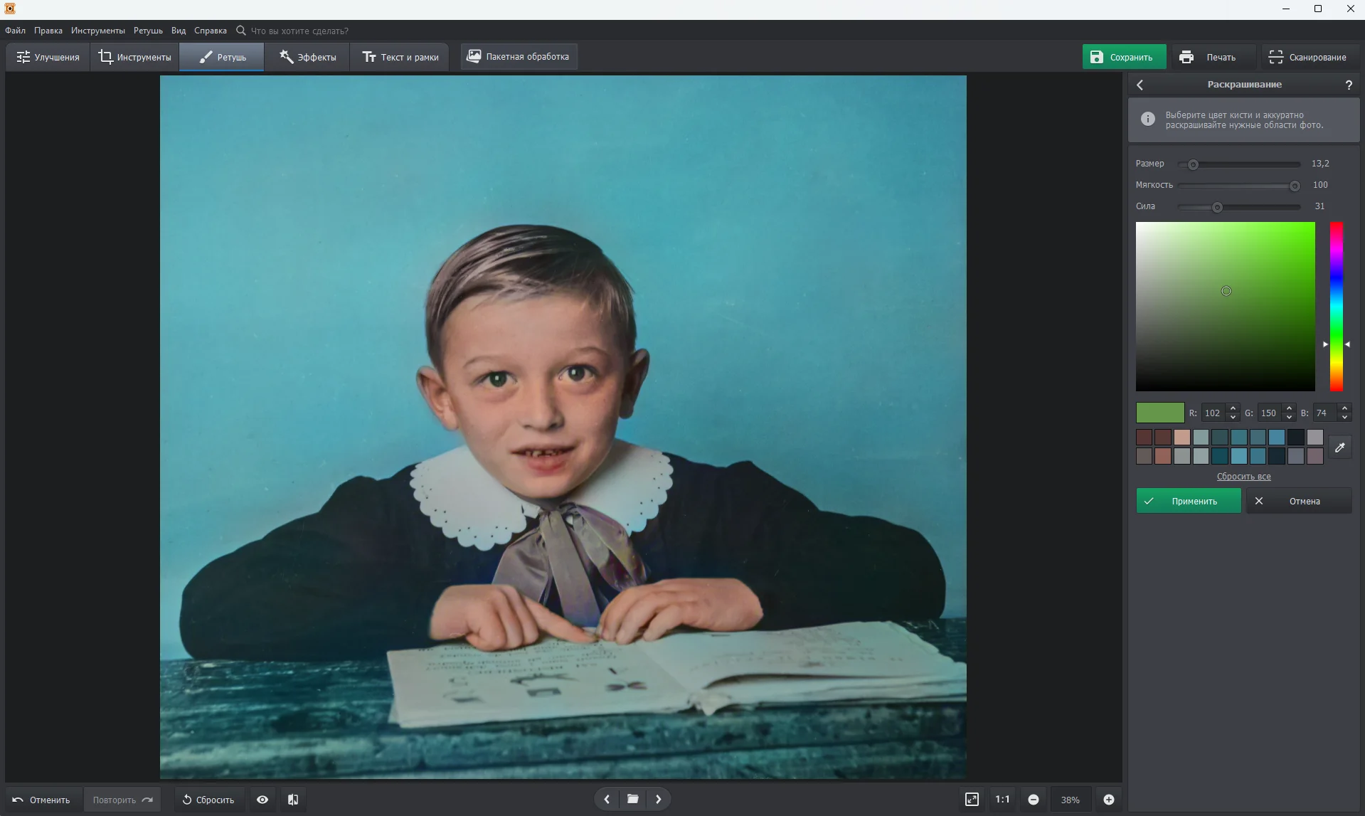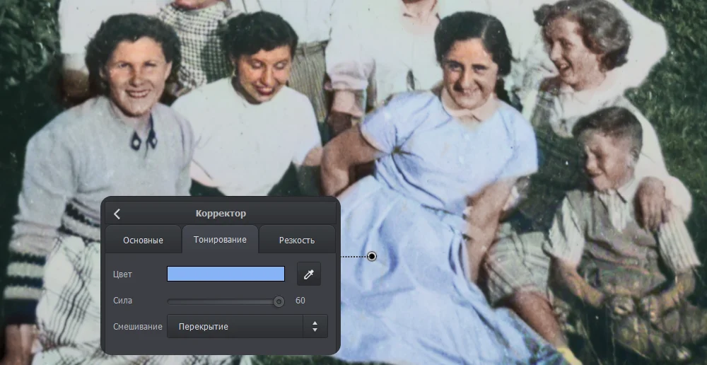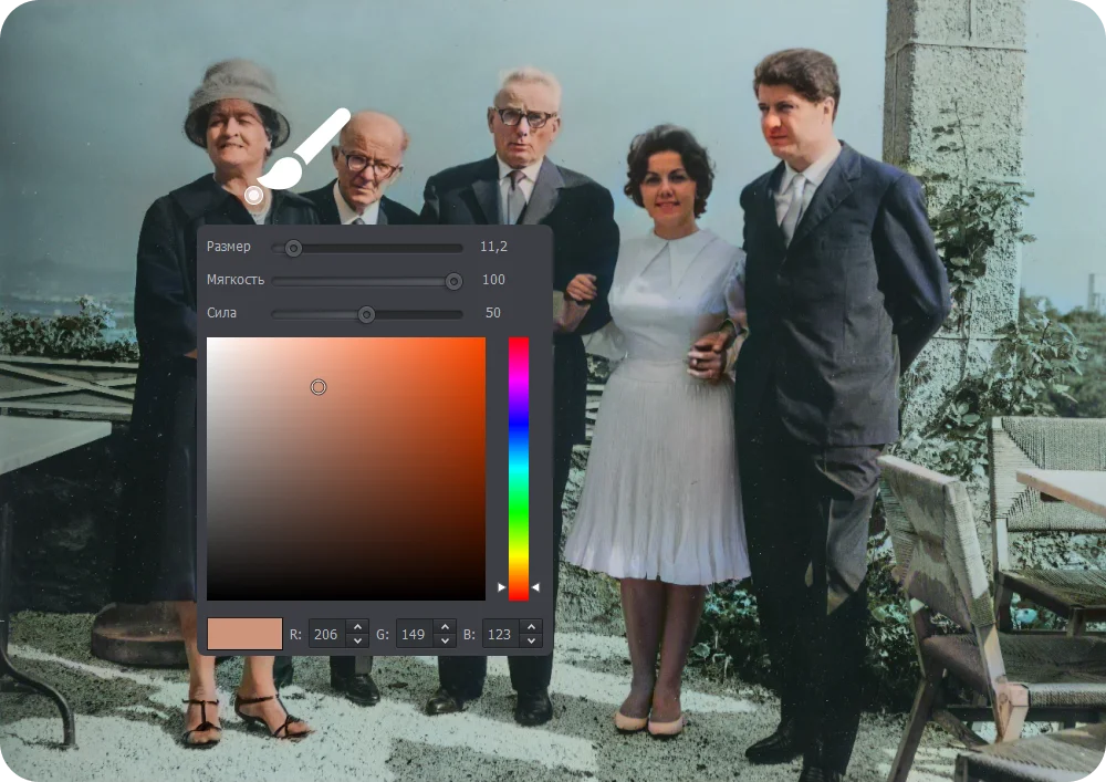 Запустите автоматический режим, и ФотоВИНТАЖ бережно наполнит снимок естественными оттенками. Доработайте результат кистью: выбирайте цвета, чтобы восстановить памятные детали. Аккуратно закрасьте нужные области,