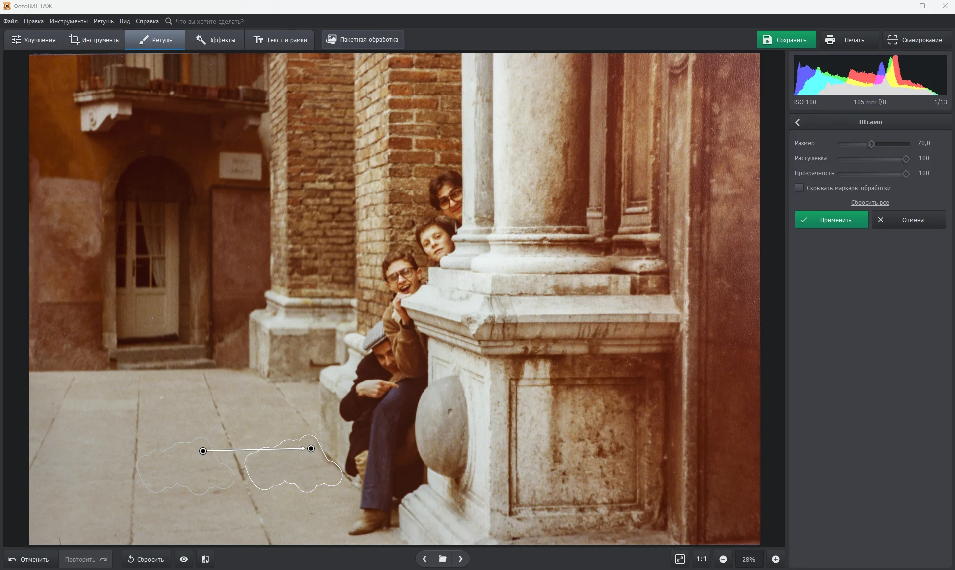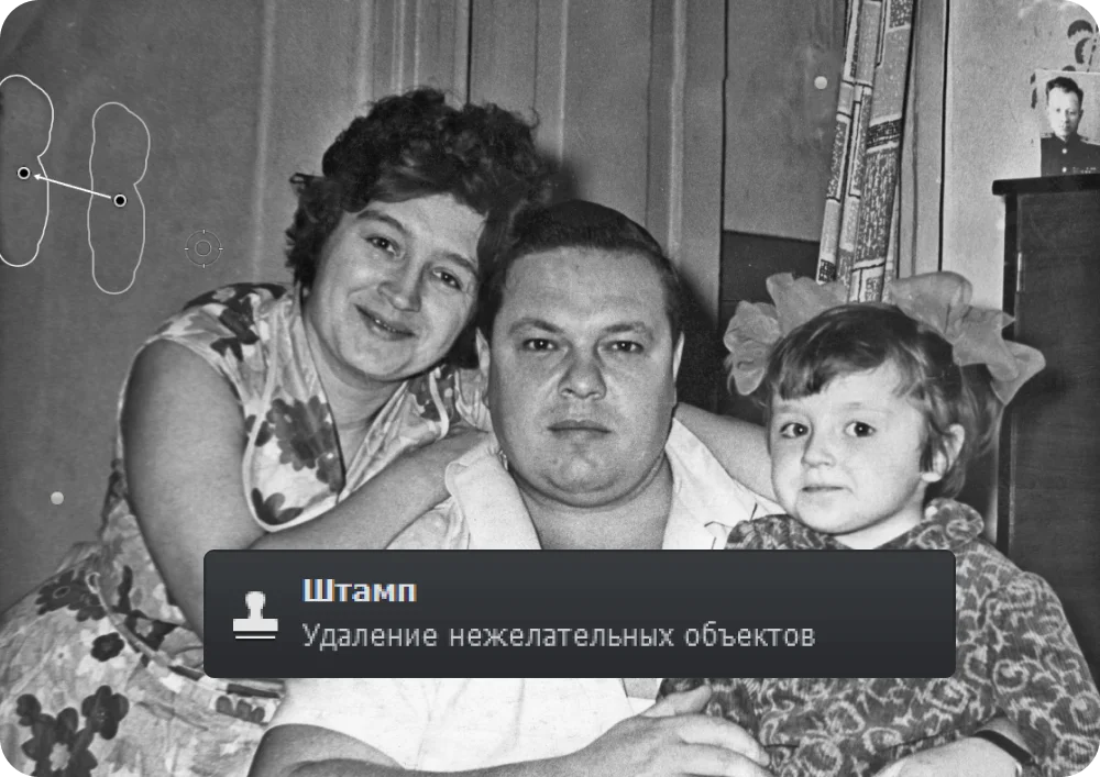 Легко убирайте с фотографий царапины, пятна и разрывы. Воспользуйтесь автоматическим удалением или точечно обработайте проблемные участки с помощью «Штампа»