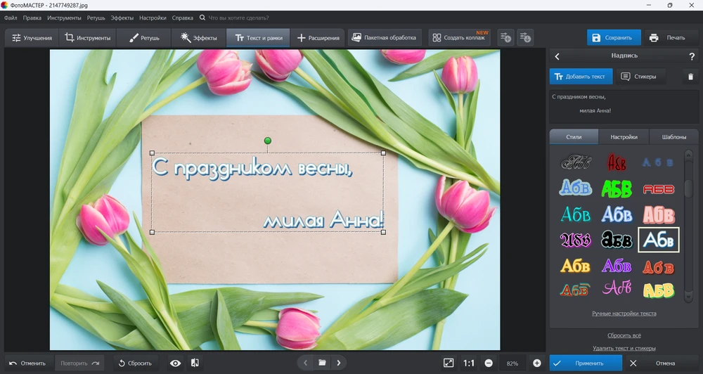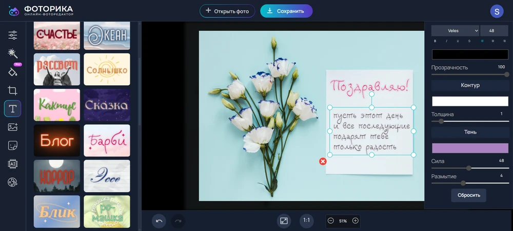 Простая и удобная программа для создания картинок с текстом. Здесь можно оформлять визитки, сертификаты, пригласительные на торжественные мероприятия и т. д. Используйте линии, фигуры, рамки, чтобы выделить надпись. 120+ стилей текста уже есть в программе, но каждый вы можете доработать вручную: изменить прозрачность, цвет, угол наклона строки, размер букв.