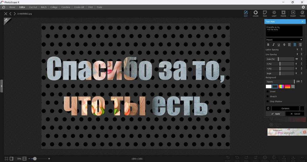 Пакет приложений с большими возможностями для нанесения текста на фотографии. Здесь вы легко измените размер, цвет и расстояние между буквами, а еще добавите стильную обводку с градиентом, текстурой или даже вашим изображением. Дополнительно можно применить эффекты в виде падающей тени, внутреннего или внешнего свечения, тиснения и проч. Есть и функция текстовой маски: загруженная картинка остается только в границах надписи, а все, что находится за контурами, скрывается.