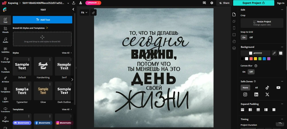 Данная платформа предназначена для создания и редактирования видеоматериалов. Но есть здесь и возможность написания текста. Накладывать можно не только слова, но и эмоджи либо картинки WordArt. Предусмотрена опция их анимации.