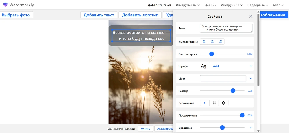 Сервис, где текстом изображения могут стать любые фразы либо водяные знаки. Для трансформации цитат имеется удобное меню настроек, в котором легко подобрать стиль, цвет, выполнить позиционирование и добавить эффект (тень, свечение, подложку).