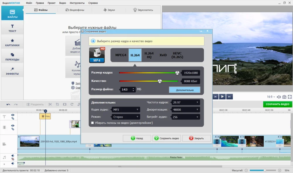 - Появятся все доступные кодеки, выберите нужный. Например, MP4 H.264. Щелкните «Далее». В новом окне поставьте «Размер кадра» и «Качество» (битрейт), затем нажмите «Сохранить видео» и укажите папку для экспорта.