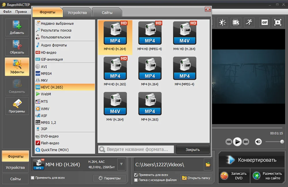 Нужно быстро сжать фильм, чтобы меньше весил? Обратите внимание на эту программу для Windows. ВидеоМАСТЕР позволяет не только уменьшать объем, но и выполнять простой монтаж, добавлять эффекты и надписи. Его ключевое достоинство — библиотека готовых профилей для популярных сайтов и устройств. Это делает процесс конвертации удобным и быстрым для пользователя без специальных знаний. Например, вы можете подготовить фильм в 480р, 720р, 1080р к публикации на YouTube в пару кликов.
